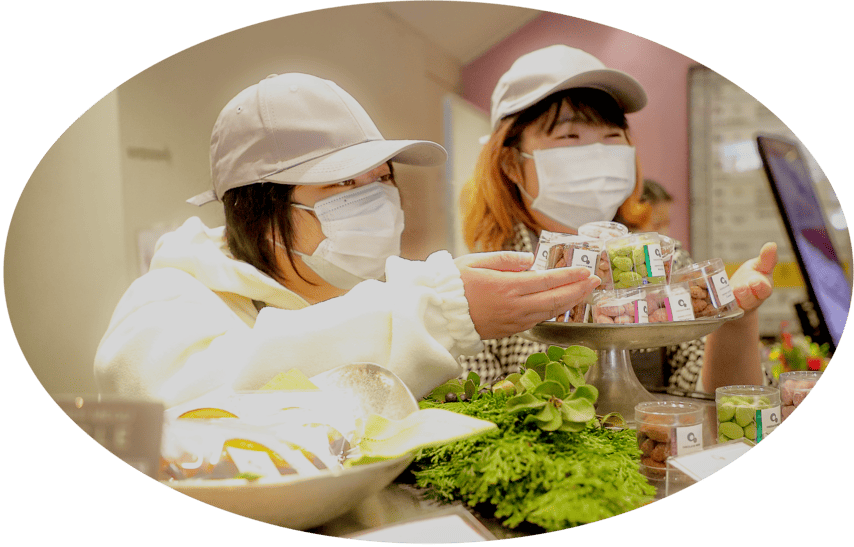 障がいのある方々が、計量・成型・デコレーションから包装まで、それぞれが得意な工程を担当し無理なくチームで商品作りをしています。